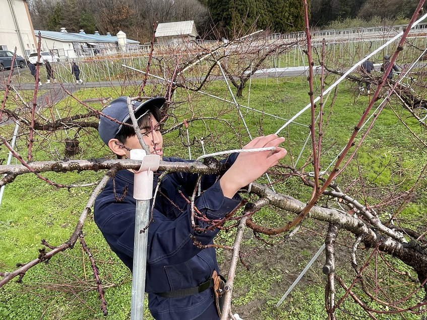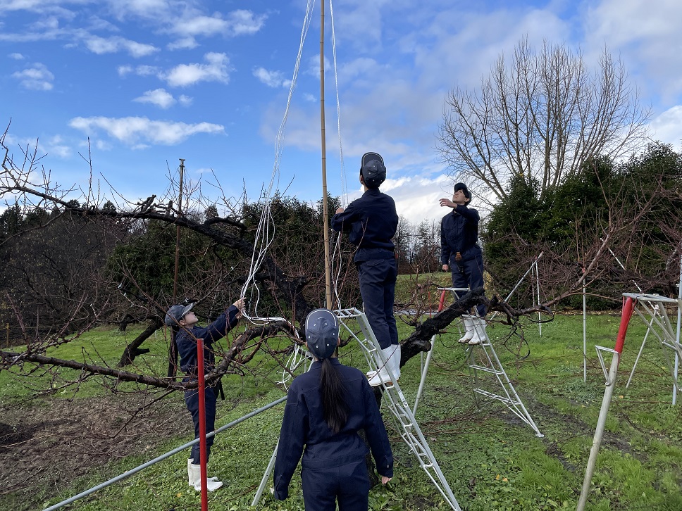 12月10日(水)に3年生総合実習の授業でモモの雪吊りを行いました。この作業は、モモの枝が雪で折れないようにするための重要な作業です。