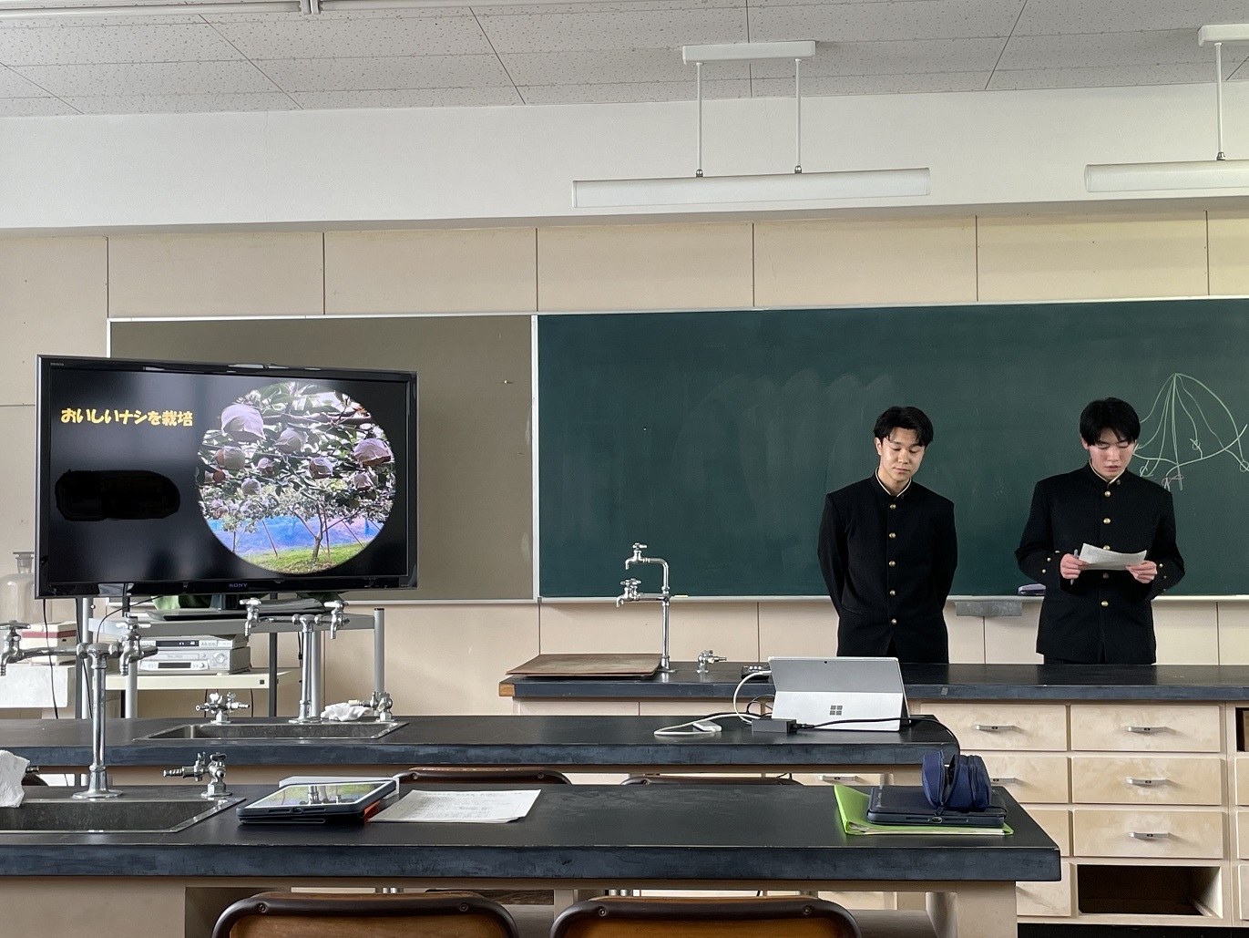 ブドウを用いた食育の研究や、竹の暗渠を設置したことによる洋ナシの品質改善に関する研究等3つの研究班がそれぞれ発表を行いました。どの班も2年間の成果を丁寧にまとめ、堂々と発表していました。ここで学んだプレゼンテーション技術を社会に出てからも活かしていきたいと思います。
